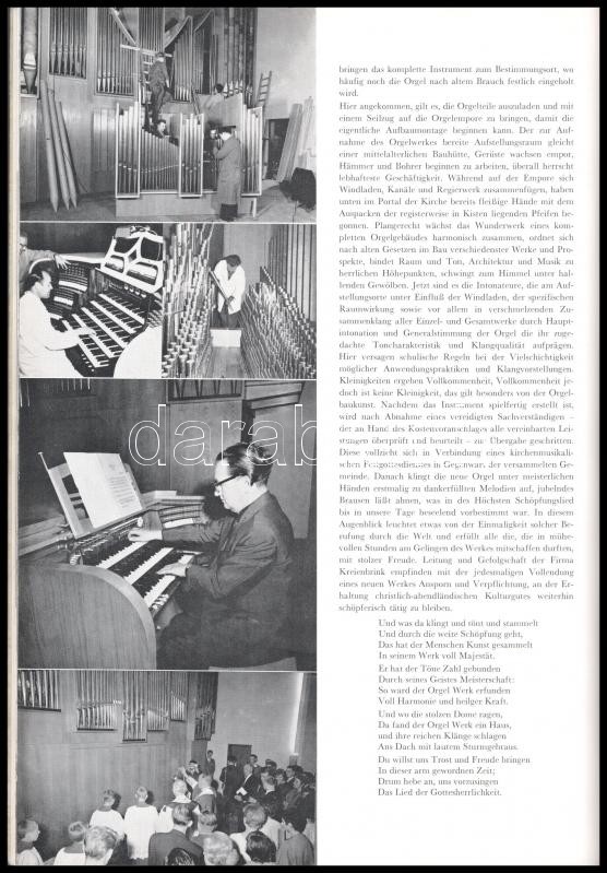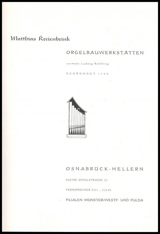 Leírás: Matthias Kreienbrink Orgelbauwerkstätten vormals Ludwig Rolfing. Osnabrück-Hellern,(1962), Matthias Kreienbrink. Német nyelven. Fekete-fehér fotókkal illusztrált. Papírkötés.