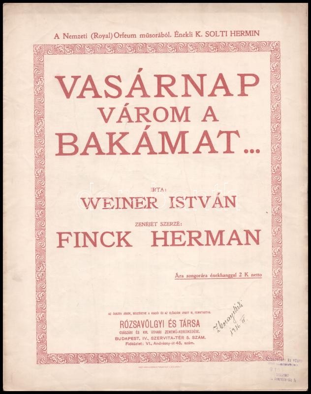 Leírás: Vasárnap várom a bakámat. Írta: Weiner István. Zenéjét szerezte: Finck Herman. Bp., Rózsavölgyi és Társa.