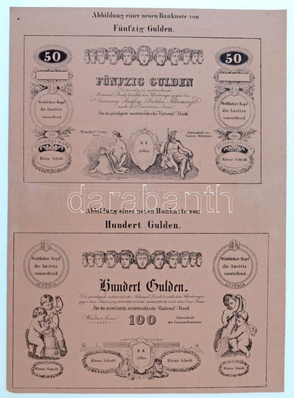 Ausztria 1841. 50G + 100G + 1000G bankjegyeket ábrázoló tájékoztató, hajtott, apró szakadások