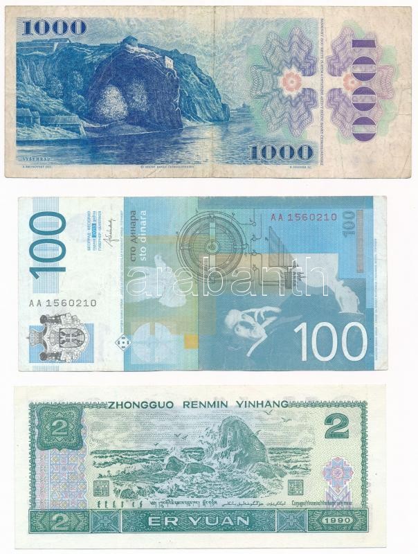 Vegyes 3 db-os bankjegy tétel, benne csehszlovák, szerb és kínai darabbal T:I,III