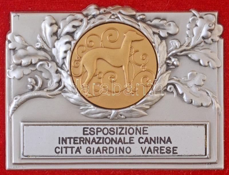 Leírás: DN "Nemzetközi Kutyakiállítás - Varese" aranyozott, ezüstözött fém plakett kissé sérült tokba ragasztva (58x76mm) T:1-