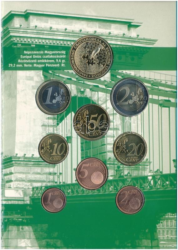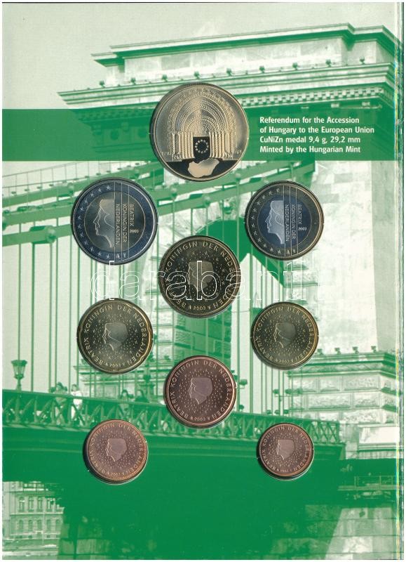 Hollandia 2003. 1c-2E (8xklf) + "Népszavazás Magyarország Európai Uniós csatlakozásáról" fém emlékérem (29,2mm) , "Magyar Nemzeti Bank Információs készlet" forgalmi szett dísztokban, magyar és angol nyelvű T:BU Netherlands 2003. 1 Cent - 2 Euro (8xdiff) + "Referendum for the Accession of Hungary to the European Union" metal commemorative medal (29,2mm), "Hungarian National Bank Information Set" coin set in cardboard case, Hungarian and English language C:BU