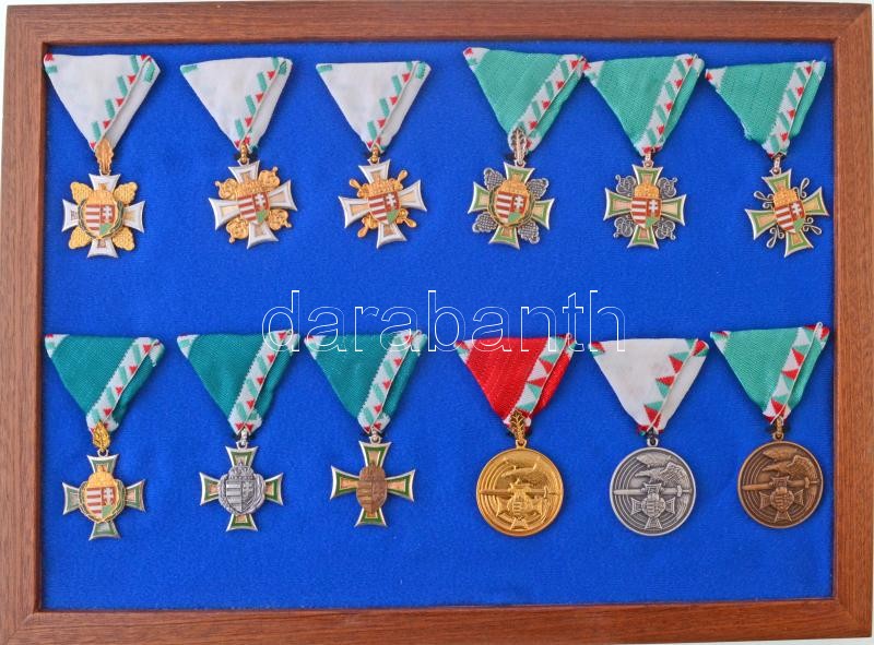 1996. "A Tiszti Szolgálati Jel I., II., III. fokozata", 3db klf tűzzománcozott, aranyozott, ezüstözött tombak kitüntetés mellszalagon + 1996. "Tiszthelyettesi Szolgálati Jel I., II., III. fokozata", 3db klf ezüstözött tombak kitüntetés, aranyozott és zománcozott államcímerrel, mellszalagon + 1992. "Honvédelemért Kitüntető Cím I., II., III. fokozata" 3db klf zománcozott kitüntetés, aranyozott/ezüstözött/bronz államcímerrel mellszalagon + 1992. "Szolgálati Jel (érdem után) I., II. és III. fokozata" 3db klf tombak kitüntetés mellszalagon T:1 / Hungary 1996. "Distinction for an Officer in Service, 1st, 2nd and 3rd Grade" 3pcs of diff, enamelled, golded, silvered tombac decorations with ribbons + Hungary 1996. "Distinction for a NCO's Service, 1st, 2nd and 3rd Grade" 3pcs of diff, silvered tombac decorations with golded and enamelled coat of arms, with ribbons + Hungary 1992. "Title of Merit (for Defence), 1st, 2nd and 3rd Grade" 3pcs of diff decorations with golded/silvered/bronze coat of arms, with ribbons + Hungary 1992. "Distinction for Service (for Merit), 1st, 2nd and 3rd Grade" 3pcs of diff tombac decorations with ribbons, C:UNC NMK 794, 795, 796, 797, 798, 799, 791, 792, 793, 785, 786, 787.