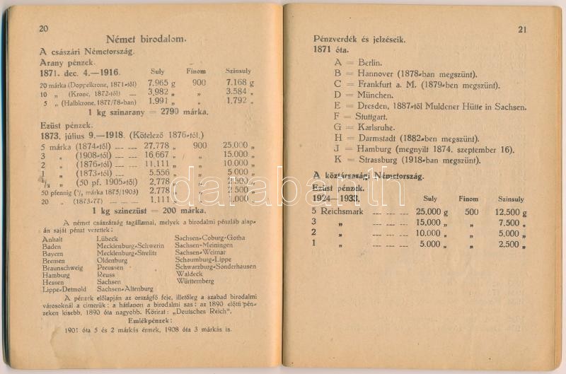 Leírás: Szigeti István (szerk.): Zseb-éremlexikon - A Világ összes pénzei. Budapest, 1943.