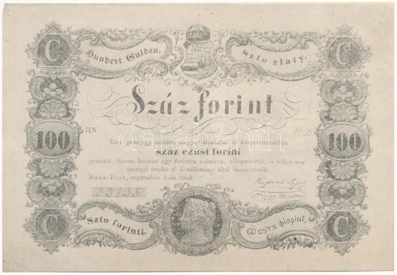 1848. 100Ft "Kossuth bankó" imitációja, hátoldalán "Nyomatott a Magyar Nemzeti Múzeum Magyarország története a honfoglalástól 1849-ig c. kiállításon 1967. május 31." T:I-