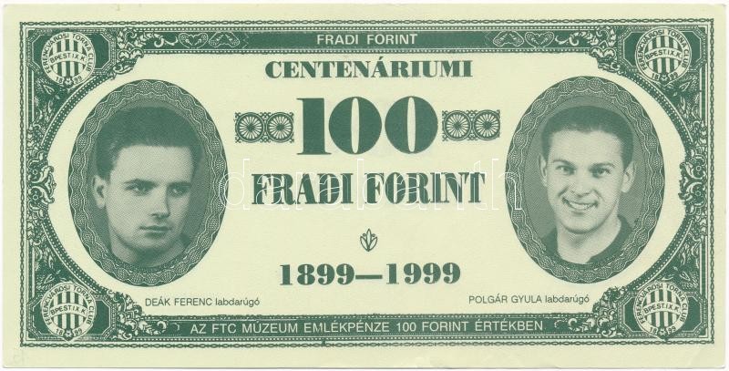 Leírás: 1999. 100Ft névértékű "Fradi Forint" Deák, Polgár, Malaky, Sinkovits fényképével T:I-,II bal alsó sarokban jelölés tollal