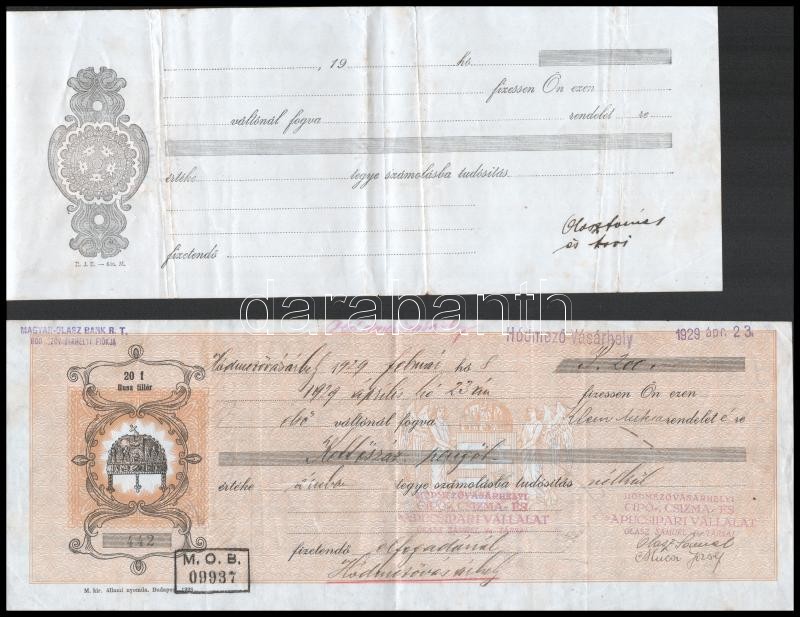 Hódmezővásárhely 1929. "Hódmezővásárhelyi Cipő-, Csizma- és Papucsipari Vállalat - Olasz Sámuel és Társai" 10f és 20f váltója bélyegzésekkel, tépéssel érvénytelenítve + 1928. kitöltetlen váltó bélyeggel és bélyegzéssel T:III