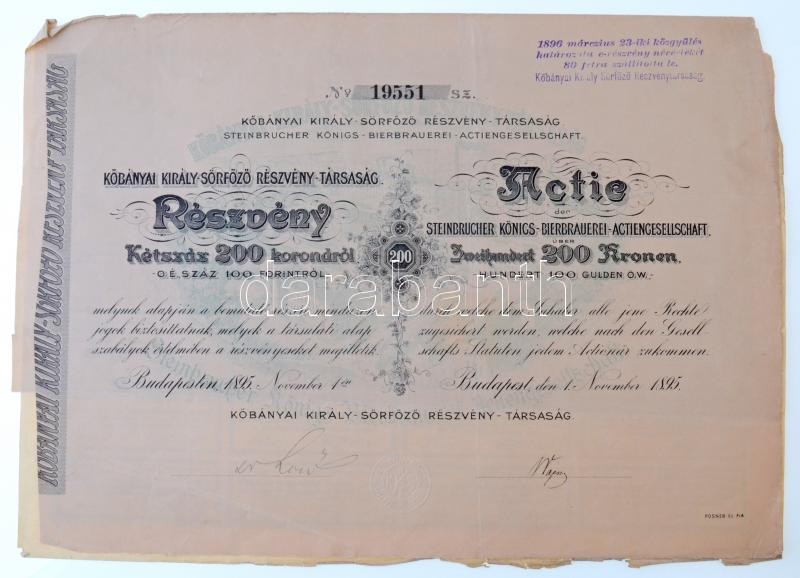 Budapest 1895. "Kőbányai Király-Sörfőző Részvénytársaság" ré... https://www.darabanth.com/hu/374-Gyorsarveres/374.0/Numizmatika/Reszvenyek-es-sorsjegyek~1500005/Budapest-1895-Kobanyai-Kiraly-Sorfozo-Reszvenytarsasag-reszvenye-200K-rol-szarazpe~II2186495