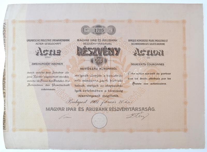 Leírás: Budapest 1901. "Magyar Ipar és Árubank Részvény-Társaság" részvénye szelvényekkel, bélyegzéssel T:II