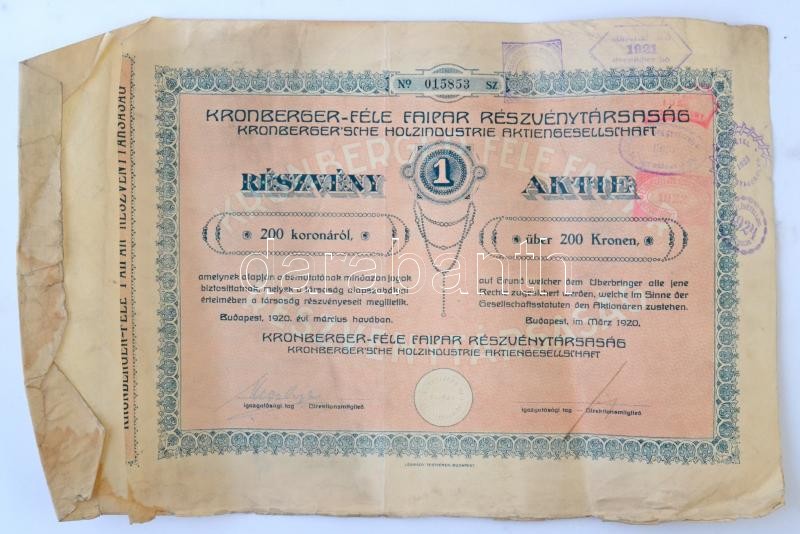 Budapest 1920. "Kronberger-féle Faipar Részvénytársaság" rés... https://www.darabanth.com/hu/374-Gyorsarveres/374.0/Numizmatika/Reszvenyek-es-sorsjegyek~1500005/Budapest-1920-Kronberger-fele-Faipar-Reszvenytarsasag-reszveny-200K-rol-felulbelyegze~II2137596