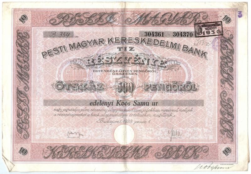 Budapest 1928. "Pesti Magyar Kereskedelmi Bank" tíz részvénye egyben, összesen 500P-ről, névre szóló, szelvényekkel, szárazpecséttel, bélyegzésekkel T:II-