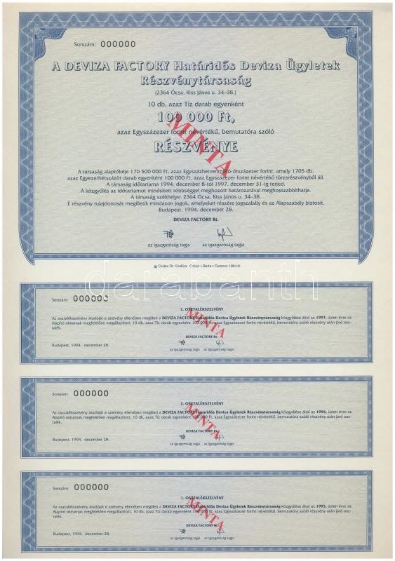 Leírás: Budapest 1994. "Deviza Factory Határidős Deviza Ügyletek Részvénytársaság" 10db bemutatóra szóló részvénye egyenként 100.000Ft-ról, szelvényekkel, "MINTA" bélyegzéssel T:I