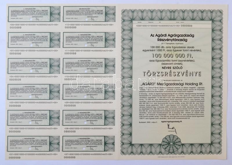 Leírás: Budapest 2002. "Agárdi Agrárgazdaság Részvénytársaság" törzsrészvénye 100.000.000Ft-ról "MINTA" perforációval, szelvényekkel, lyukasztással érvénytelenítve T:I