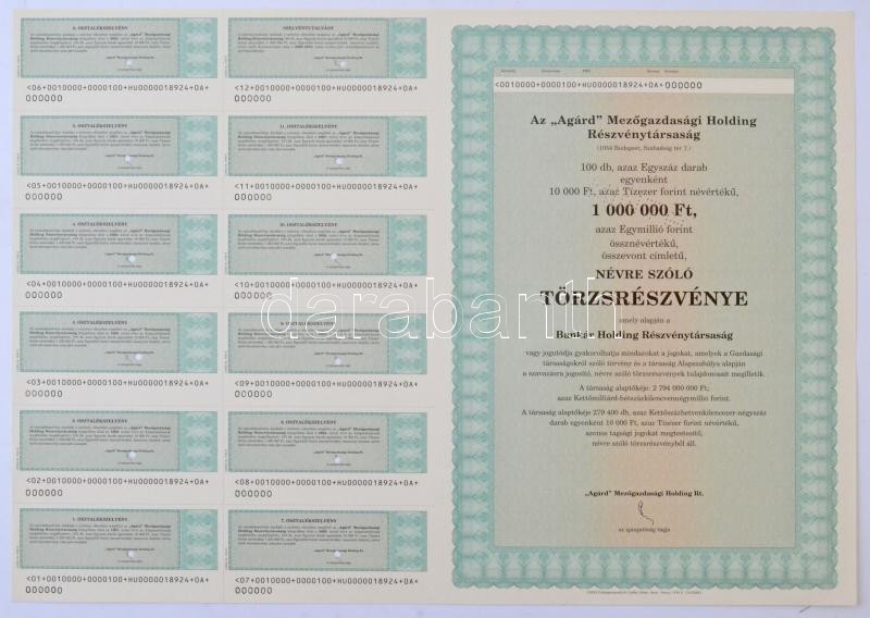 Leírás: Budapest ~1990. " 'Agárd' Mezőgazdasági Holding Részvénytársaság" törzsrészvénye 1.000.000Ft-ról "MINTA" perforációval, szelvényekkel, lyukasztással érvénytelenítve T:I