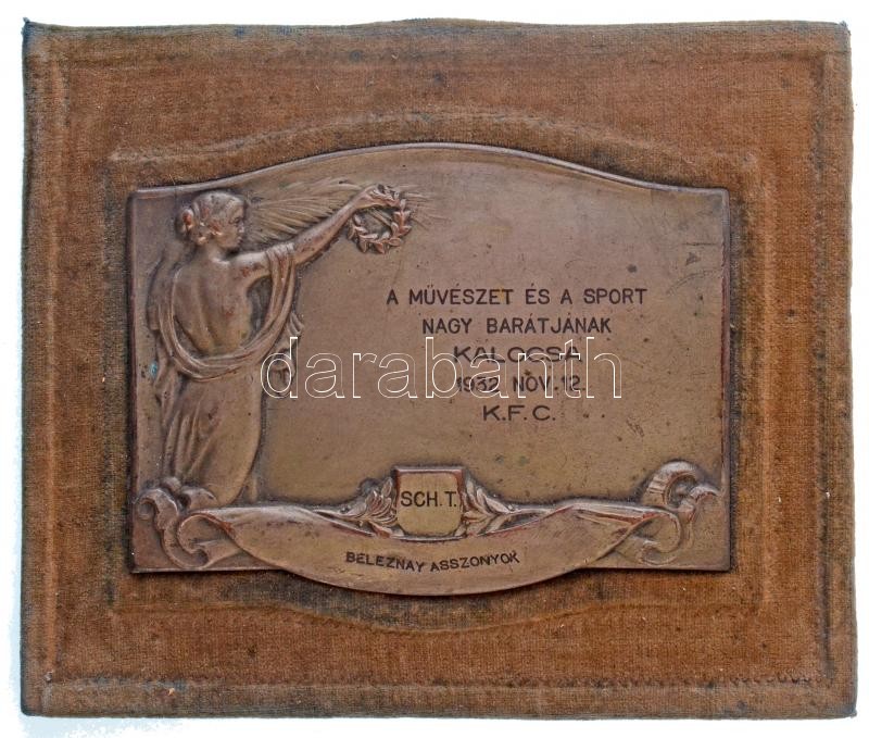 1932. "A művészet és a sport nagy barátjának - Kalocsa - 1932. nov. 12. - K.F.C. (Kalocsai Football Club) - Sch. T. - Beleznay asszonyok" ezüstözött Br plakett (134x101mm) bársonyborítású tartóra erősítve (187x156mm) T:2,2-