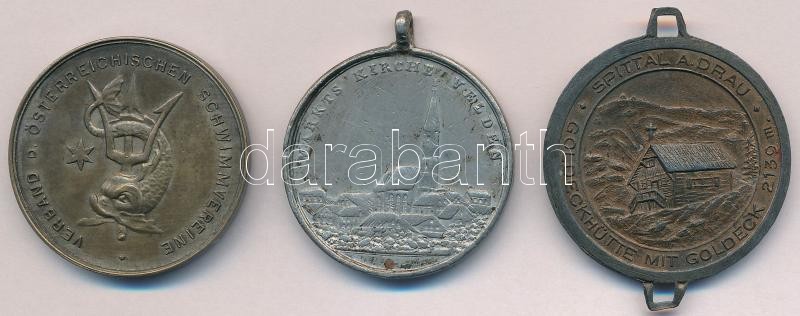 Ausztria 3db-os emlékérem és sport díjérem tétel, közte 1929. "Verbrand Österreichischen Schwimmvereine / Länderkamp - Ungarn Österreich Wien - 14. u. 15. Sept. 1929" ezüstözött fém úszósport emlékérem (33mm), "Markts Kirche Velden / Zum andenken des 1000 Iaehrigen Iubilaeums 1819" fém emlékérem füllel (32mm), "Spital a. Drau / Goldeckhütte mit Goldeck 2139m" T:vegyes