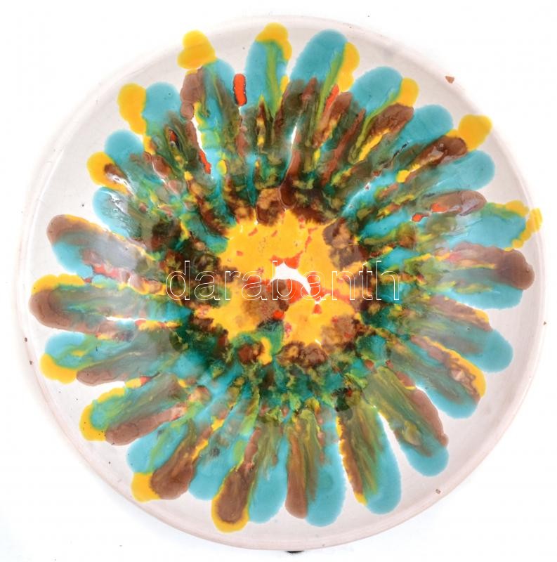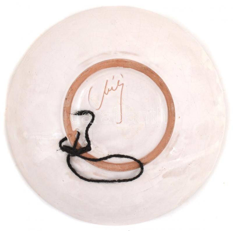 Leírás: Festett, mázas kerámia fali tál, jelzett, lepattanásokkal, d: 20 cm