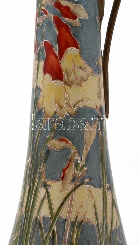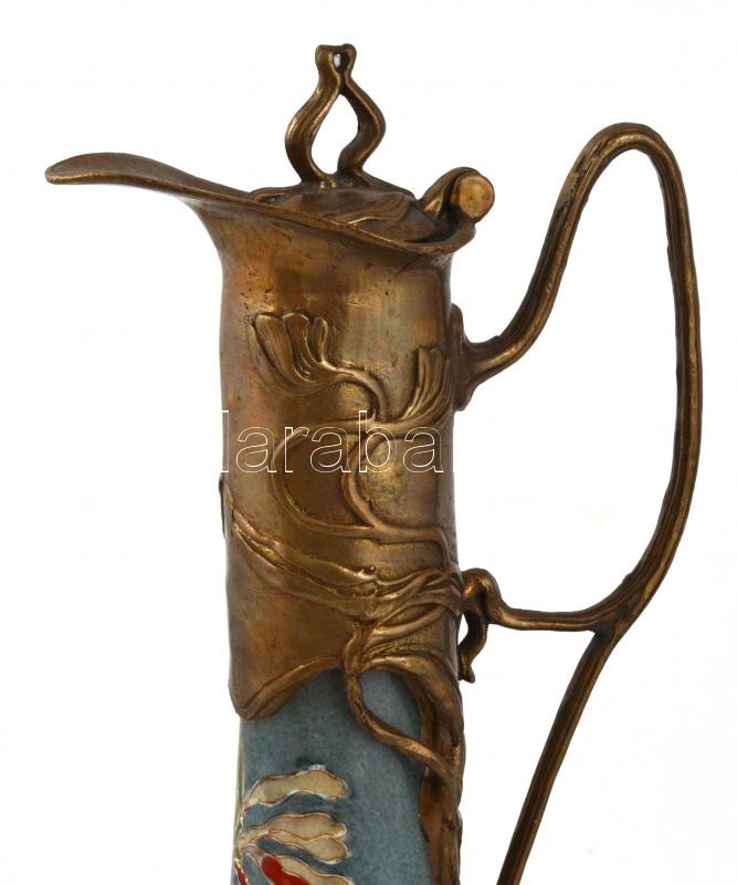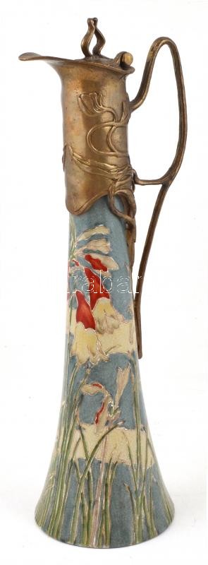 Leírás: Szecessziós stílusú virágmintás kerámia karaffa, réz szerelékkel, jelzett, kis kopásnyomokkal, m: 40 cm