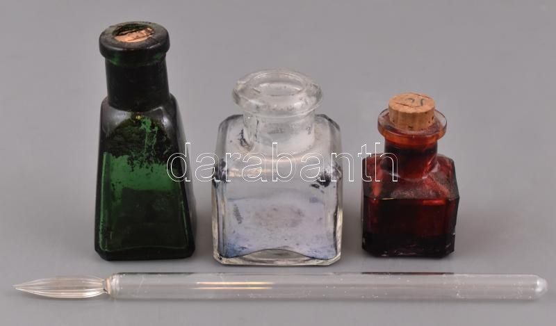 Leírás: 3 db tintás üveg használt állapotban, m: 5 cm, 5,5 cm, 7,5 cm + üveg penna, a hegye törött, h: 16 cm