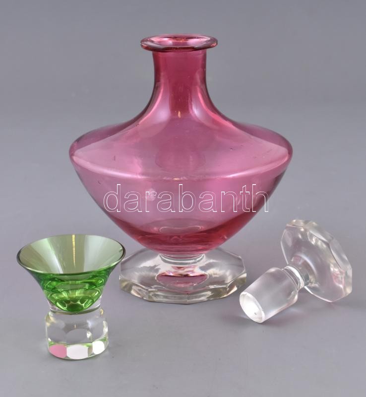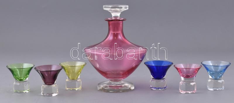 Leírás: Több színű retro talpas üveg likőrös készlet: Kiöntő dugóval + 6 db pohár m. 5,5 cm, kiöntőn egy kisebb csorbával, apró kopásnyomokkal, jelzés nélkül