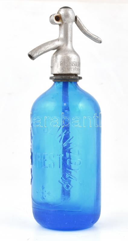 Leírás: Újpest Egyesített Szikvízgyár feliratú szódásüveg, fém fej részen Szikvízgyárt NV Budapest 1950, Fővárosi Ásvány- és Szikvízüzem K.V felirattal, m: 27 cm