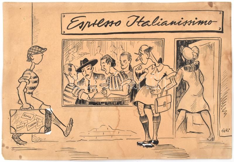 Leírás: Egri László (1910-1974): Espresso italianissimo. Karikatúra. Vegyes technika, papír. Jelzett. 18x26 cm