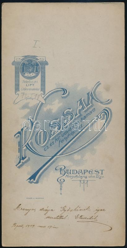 1909 Budapest, Kossák József (?-?) császári és királyi udvari és kamarai fényképész műtermében készült, keményhátú, vintage fotó, feliratozva, 21,3x10,8 cm