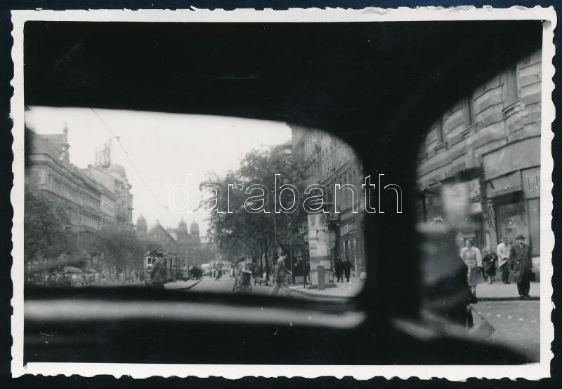 Leírás: 1955 Budapest, A Szent István körút autóból fotózva, háttérben a Nyugati Pályaudvarral, villamossal, hirdetőoszloppal, 6,5×9 cm