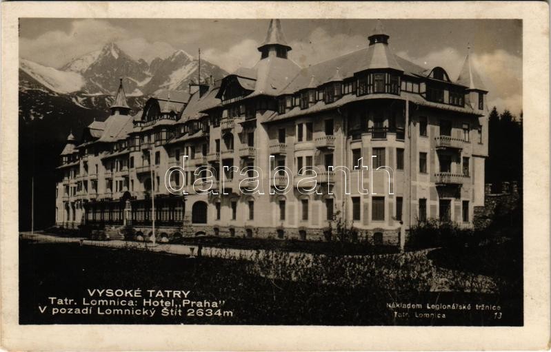 1931 Tátralomnic, Tatranská Lomnica (Tátra, Magas Tátra, Vysoké Tatry); Hotel "Praha" v pozadí Lomnicky Stít / Prága szálloda és a Lomnici-csúcs / hotel, mountain peak (fl)