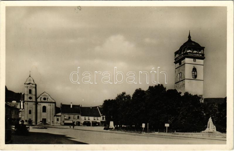 Rozsnyó, Roznava; Rákóczi tér és őrtorony, irredenta felirattal és magyar címerrel, üzletek. Fuchs József kiadása / square, watchtower with Hungarian coat of arms and irredenta propaganda