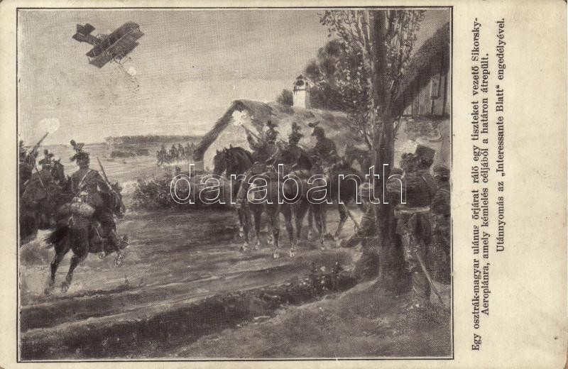 1914 Egy osztrák-magyar ulánus őrjárat rálő egy tiszteket vezető Sikorsky-Aeroplánra, amely kémlelés céljából a határon átrepült. Interessante Blatt / WWI Austro-Hungarian K.u.K. military, Uhlan patrol shoots at a spying enemy military aircraft