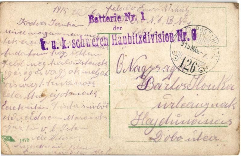 1915 Österr.-ung. Kavallerie verfolgt russische Kosaken / WWI K.u.K. (Austro-Hungarian) military art postcard + "Batterie Nr. 1. der k.u.k. Schweren Haubitzdivision Nr. 6." (EK)