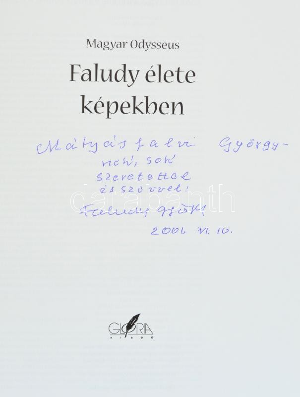 Magyar Odysseus. Faludy élete képekben. Szerk.: Bodnár János. Bp., 2000, Glória Kiadó. Színes és fekete-fehér fotókkal gazdagon illusztrált. Kiadói kartonált papírkötés papír védőborítóban, szép állapotban. Ajándékozási sorokkal Faludy György (1910-2006) által dedikált példány.