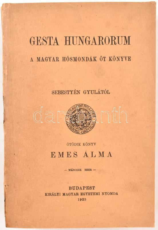 Sebestyén Gyula: Gesta Hungarorum. A magyar hősmondák öt könyve. V. kötet. Bp.,1925, Folklore Fellows Néphagyományt Kutató Nemzetközi Tudományos Szövetség Magyar Osztálya. Kiadói papírkötés. Borító, gerinc sérült.