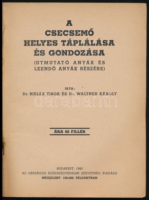 Bielek Tibor-Waltner Károly: A csecsemő helyes táplálása és gondozása. (Utmutató anyák és leendő anyák részére.) Bp., 1943, Országos Egészségvédelmi Szövetség. Kiadói papírkötés, kissé foltos borítóval. Horthy Miklósné nyomtatott ajánlásával a könyv elején.