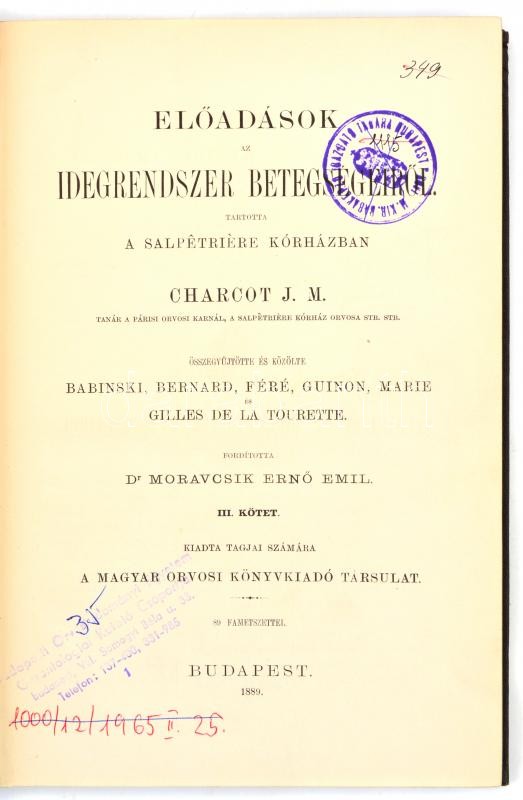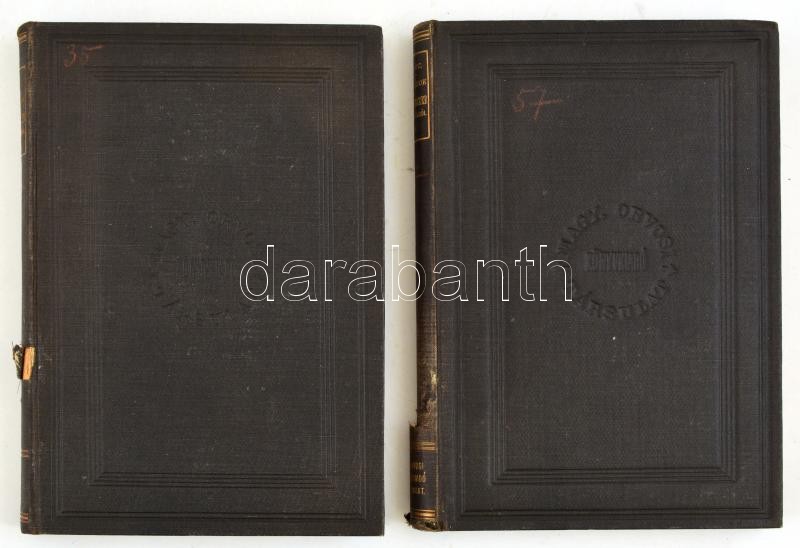 [Jean-Martin Charcot (1825-1893)]: J. M. Charcot: Előadások az idegrendszer betegségeiről. II-III. kötet. Összegyűjt. és közölte: Bourneville, Babinski, Bernard, Féré, Guinon, Marie, Gilles de la Tourette.Ford.: Koller Gyula, Morvacsik Ernő Emil. Magyar Orvosi Könyvkiadó-Társulat Könyvtára XXXV.,LVII. kötet. Bp., 1879-1889., Magyar Orvosi Könyvkiadó Társulat, XV+388 p.+ 10 t.; 367+5 p.Gazdag szövegközti képanyaggal illusztrált. Kiadói aranyozott gerincű egészvászon-kötések, Gottermayer-kötés, kissé kopott borítókkal, intézményi bélyegzőkkel, a III. kötet gerincén sérüléssel, az II. kötetből két kijáró lappal és egy kijáró táblával, hiányzó szennylapokkal.