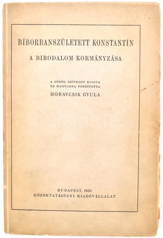 [Kónsztantinosz Porphürogennétosz]: Bíborbanszületett Konstantin: A birodalom kormányzása. A görög szöveget kiadta és fordította: Moravcsik Gyula. Moravcsik Gyula általi fordítás első kiadása. Bp., 1950., Közoktatásügyi Kiadóvállalat, 347 p. + 1 t. Görög-magyar kétnyelvű kiadás. Kiadói papírkötésben, intézményi bélyegzővel.