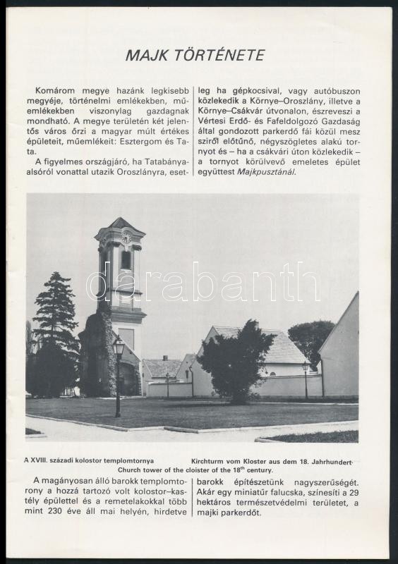 Leírás: Kulcsár Emil Miklós: Majk története. Fekete-fehér fotókkal. 1989. Papírkötésben. Magyar, angol és német nyelvű szövegekkel.