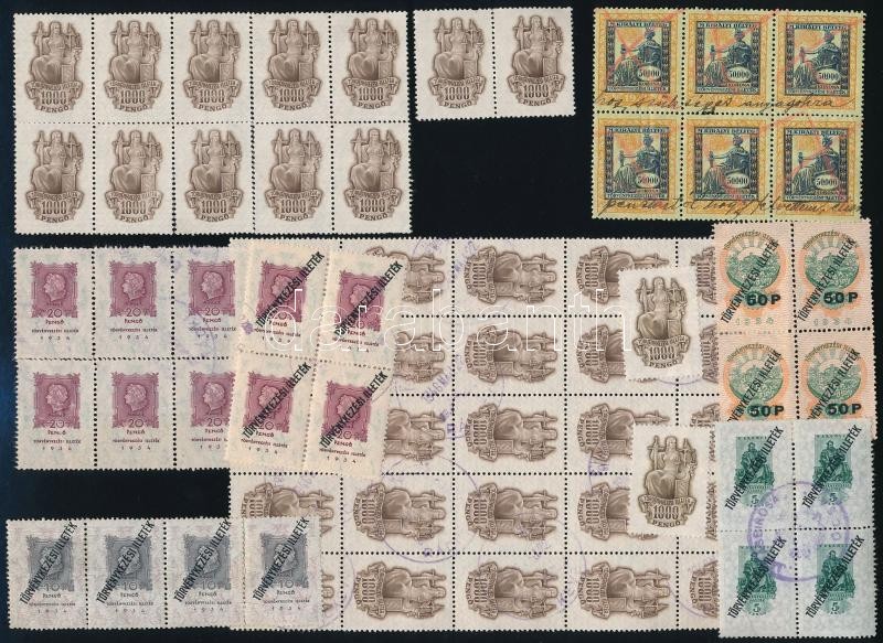 Leírás: Törvénykezési illetékbélyegek részben felülnyomva ívdarabokban