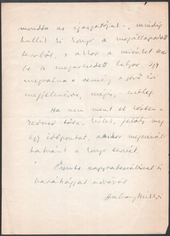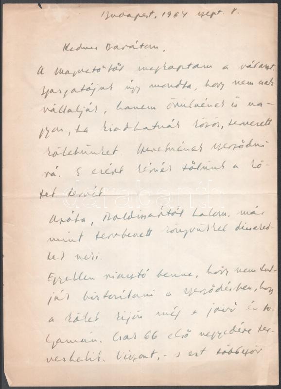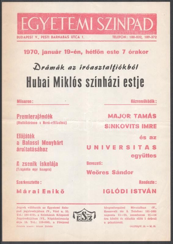1964-1970 Hubay Miklós (1918-2011) Kossuth-díjas drámaíró, műfordító saját kézzel írt levele egy ismeretlennek, saját kezű aláírásával, dátumozva (1964. szept. 8.), valamint az Egyetemi Színpad színházi estjének szórólapjával (1970.)