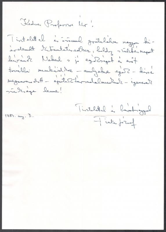 Leírás: 1984 Finta József (1935-) Kossuth-díjas építész autográf sorai és aláírása egy ismeretlennek szóló levélen, dátumozva ( 1984. aug 3.)