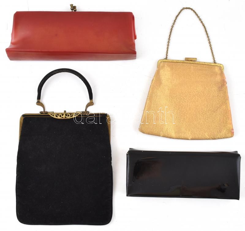 Leírás: 4 db alkalmi táska, az aranyozott kopottas állapotban, 9,5x24 és 34x21 cm közötti méretekben