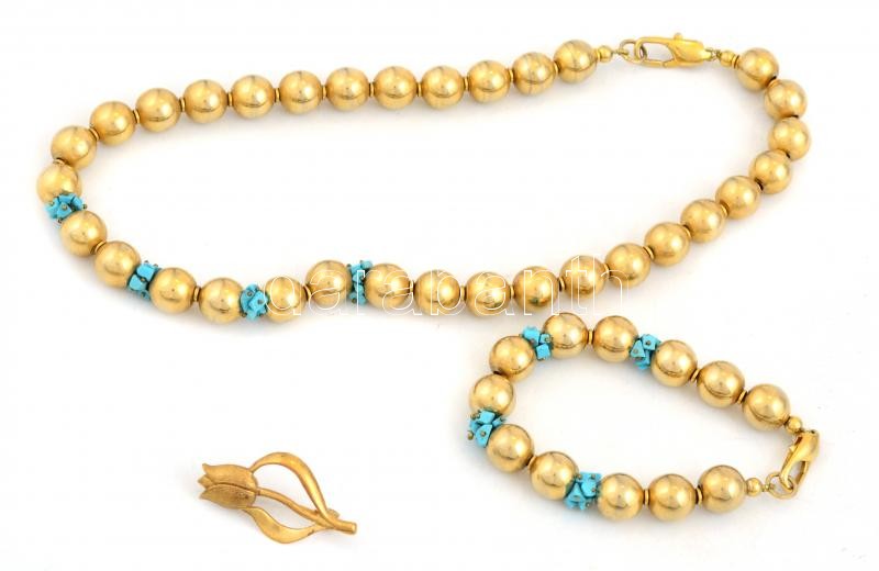 Leírás: Aranyozott bizsu gyöngyös nyaklánc és karkötő türkiz kövekekkel h: 20 cm, 46 cm + aranyozott tulipános bross, 4x2 cm