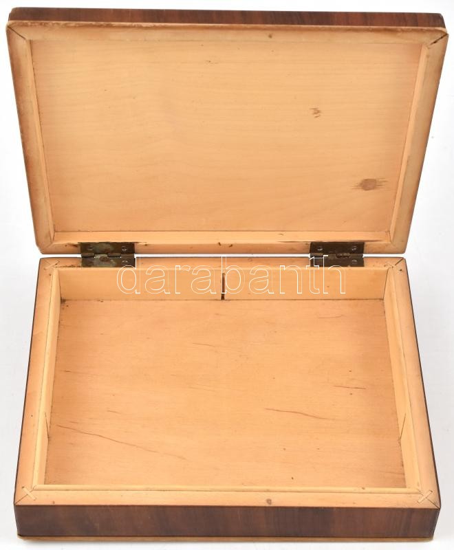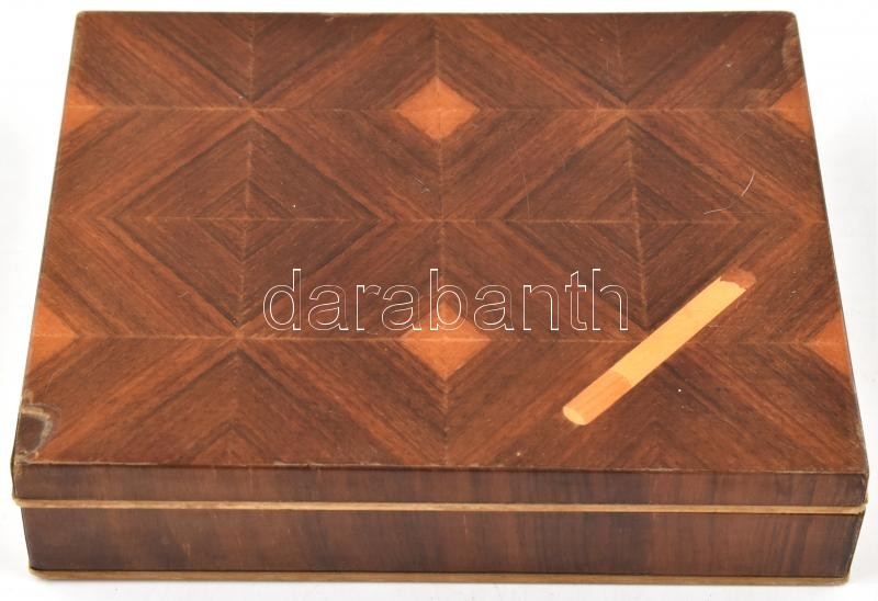 Leírás: Art deco cigarettás fa doboz, a bal alsó sarkánál sérült az intarzia 17x21,5x5 cm