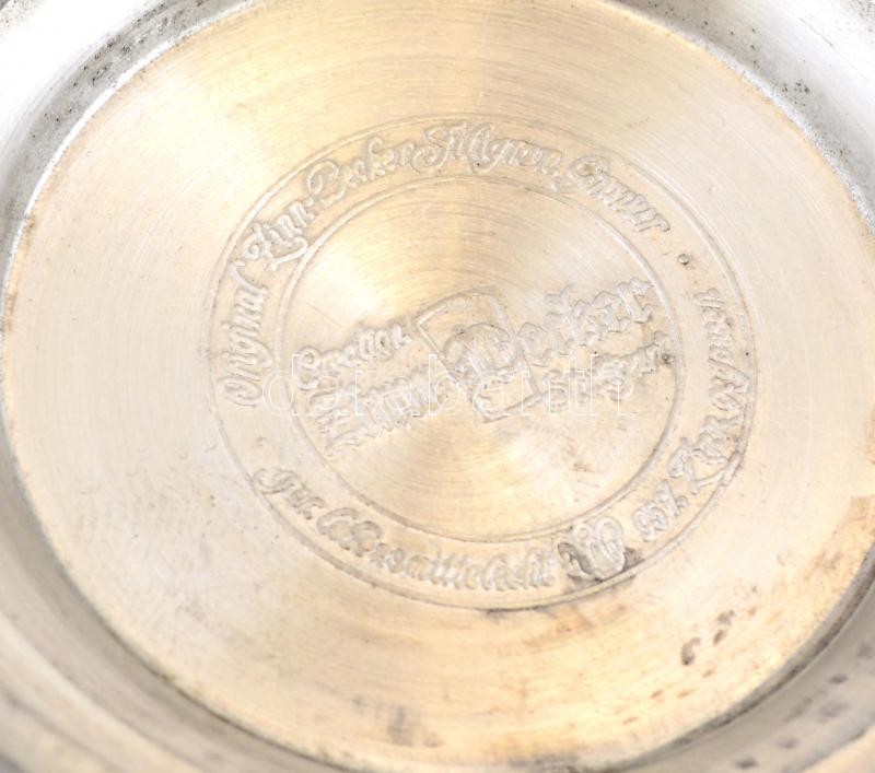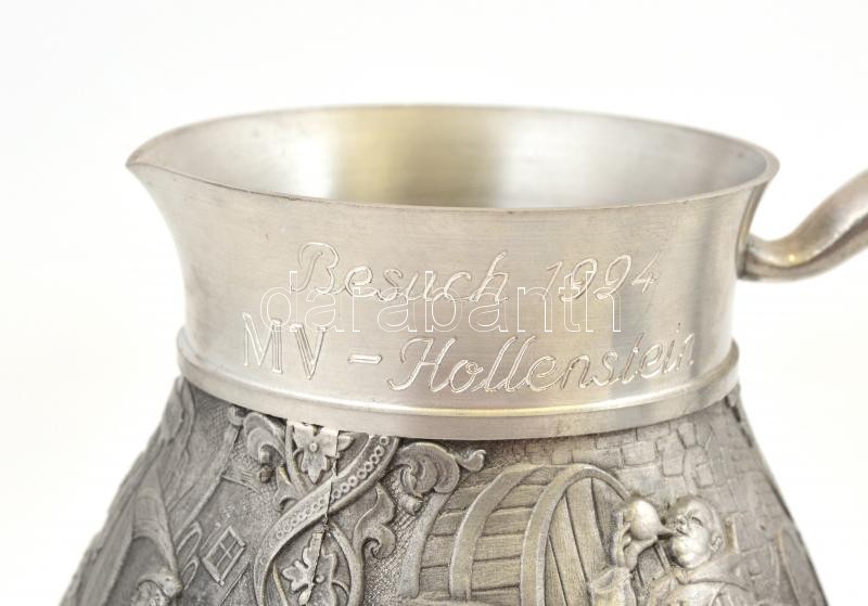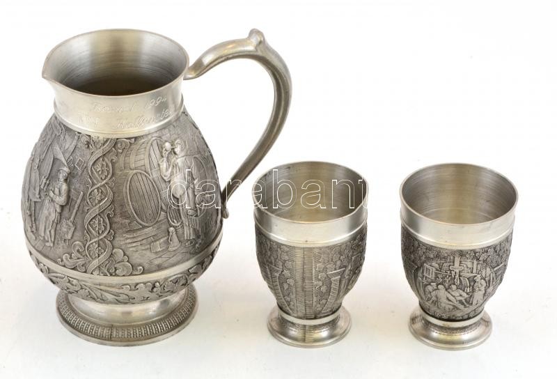 Leírás: Díszes ón kiöntő és 2 db ón kispohár, apró kopásokkal, 14,5 és 8 cm