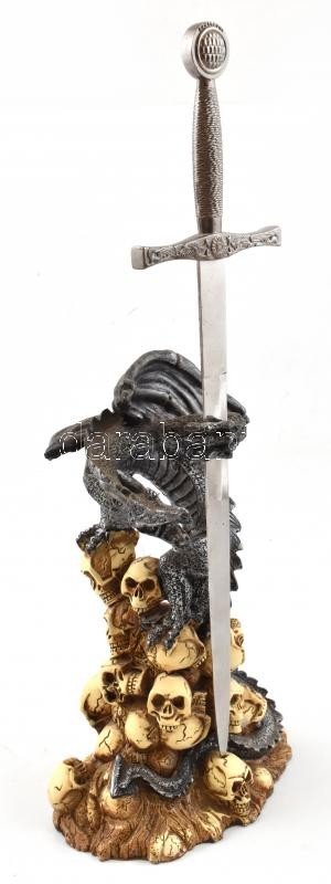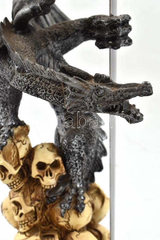 Leírás: Fém sárkány koponyákon, kivehetős karddal, 39,5x16 cm