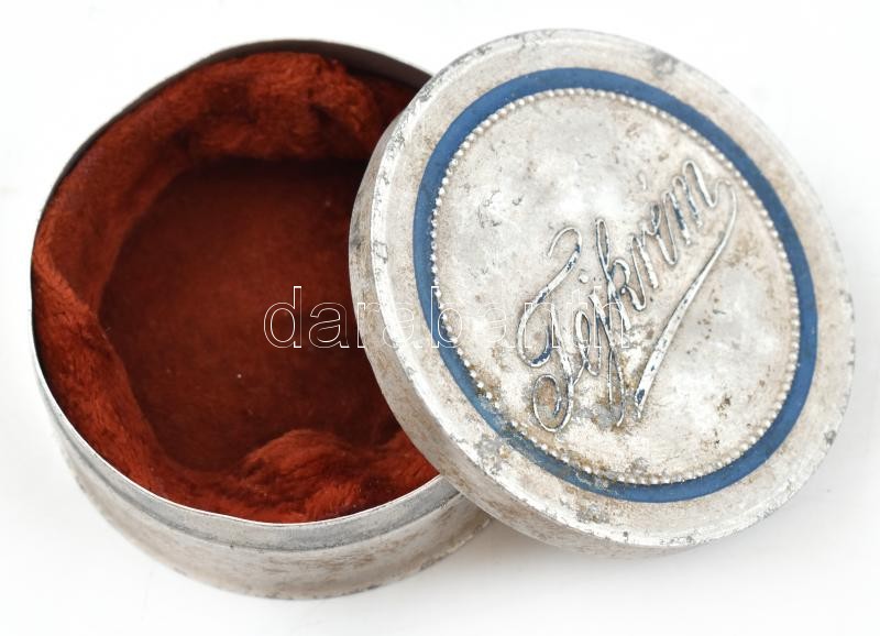 Leírás: Fém tejkrémes dobozka béléssel, kopottas állapotban, d: 6 cm, m: 2,5 cm