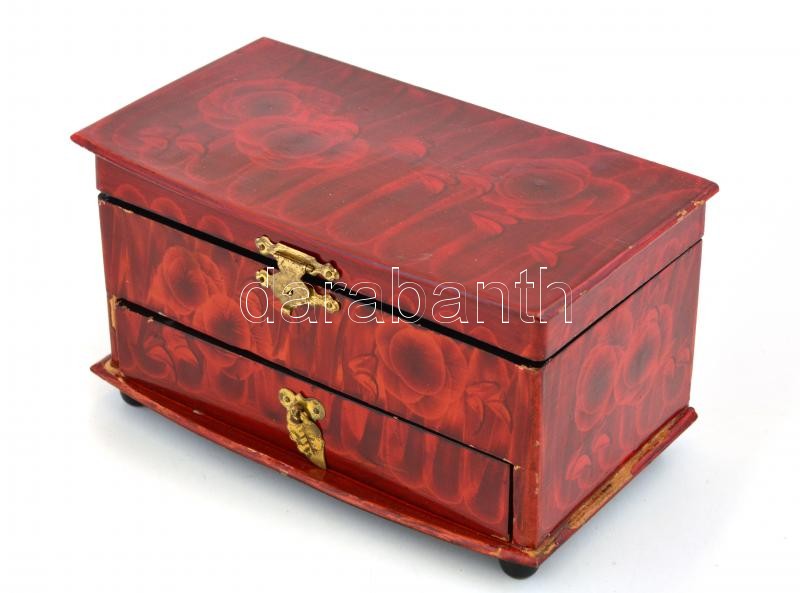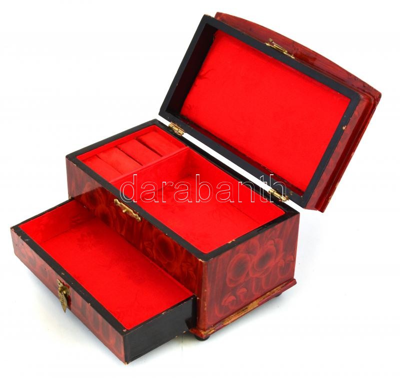 Leírás: Lakk ékszertartó doboz, kopottas állapotban, 21x12x12 cm