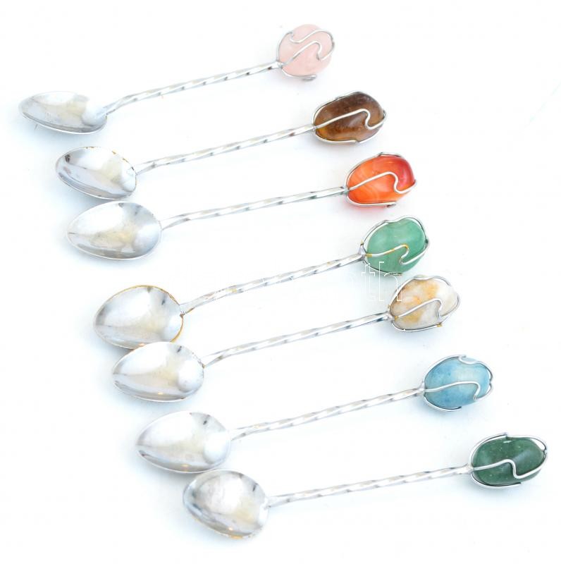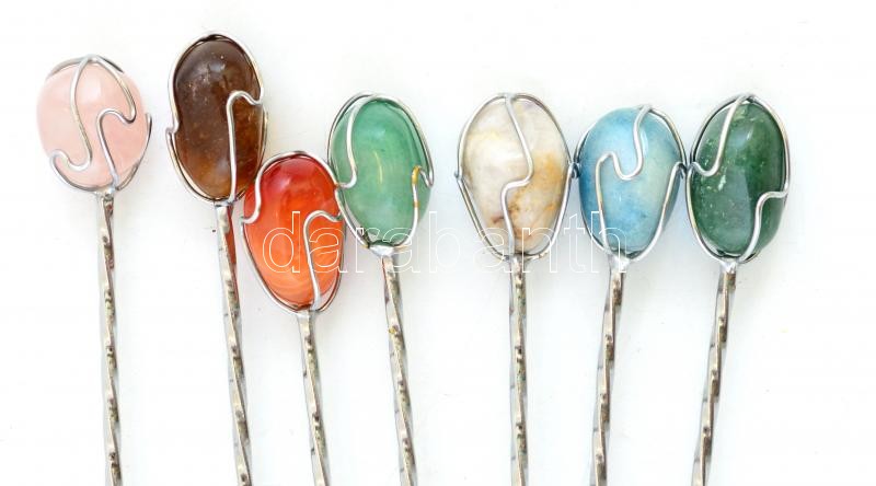 Leírás: Össz. 7 db mokkás fém kanál, végén féldrágakövekkel díszített (3 db jade, borostyán, rózsakvarc, achát és egy ismeretlen), részben kopott. h: 10 cm