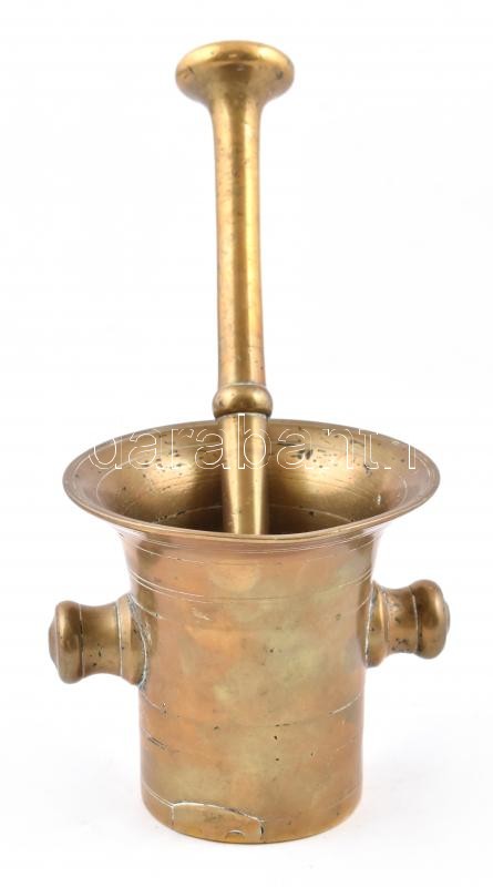 Leírás: Réz mozsár, törővel. d: 12,5 cm, m: 11,5 és 28,5 cm